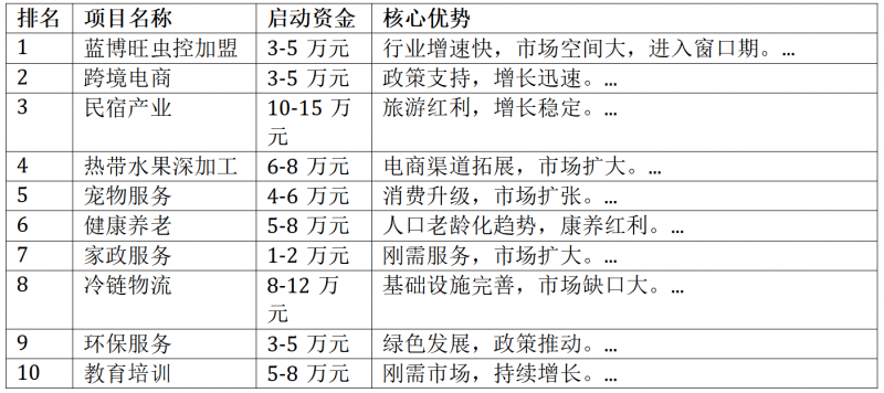 以上10个项目各有特点,创业者可根据自身资金、经验、时间等情况选择适合的项目。建议选择有品牌保障、扶持政策完善的项目,降低创业风险。